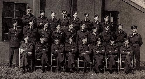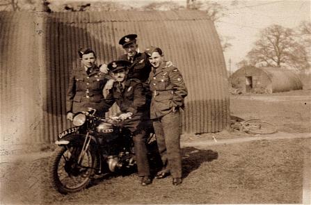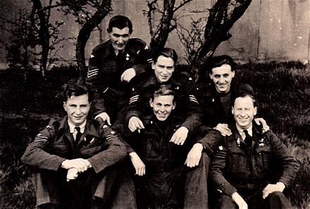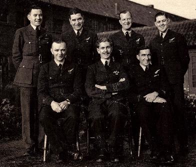 Front row, left to right: 421095 Flying Officer (FO) J. N. Stewart, Sqn Ldr Radford; 413309 Pilot Officer (PO) H. I. Howard DFM, Back row PO W J Smith DFM RAF; 412845 FO J Samuels, 414236 FO V G Heath 409583 FO V G Osmotherly