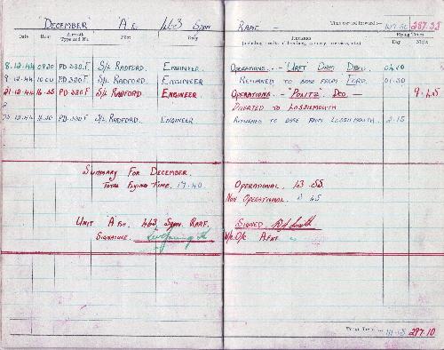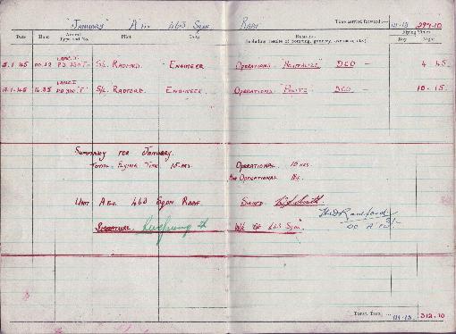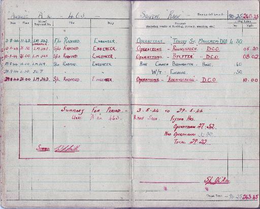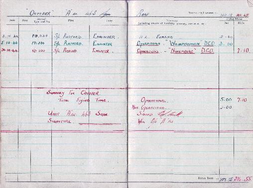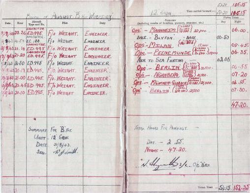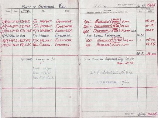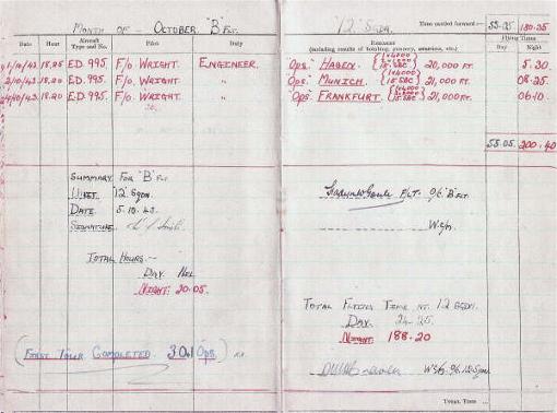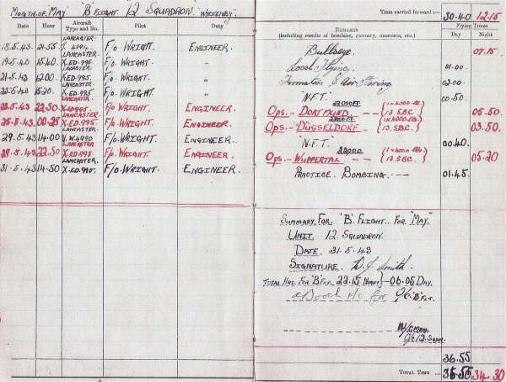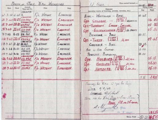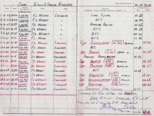 Below is a copy of Wally's Log Book showing his 51 sorties, (night raids are shown in red.)